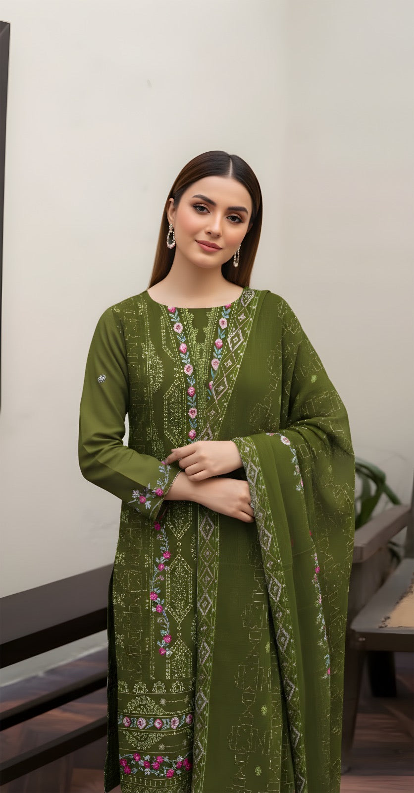 The Dhanak 3 Piece Luxury Embroidered Collection brings together elegance and tradition with premium craftsmanship. Featuring a heavy panel style embroidered front with daman embroidery and boring daman patch, paired with a finely detailed embroidered back and sleeves, this suit reflects timeless artistry. The full embroidered dupatta with 4 pallu borders enhances its grandeur, while the dyed trouser completes the look with sophistication. Designed in premium Dhanak fabric, this collection is ideal for festive and formal occasions, offering both luxury and durability.